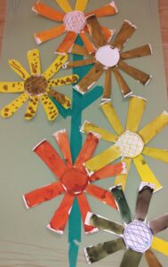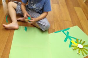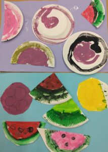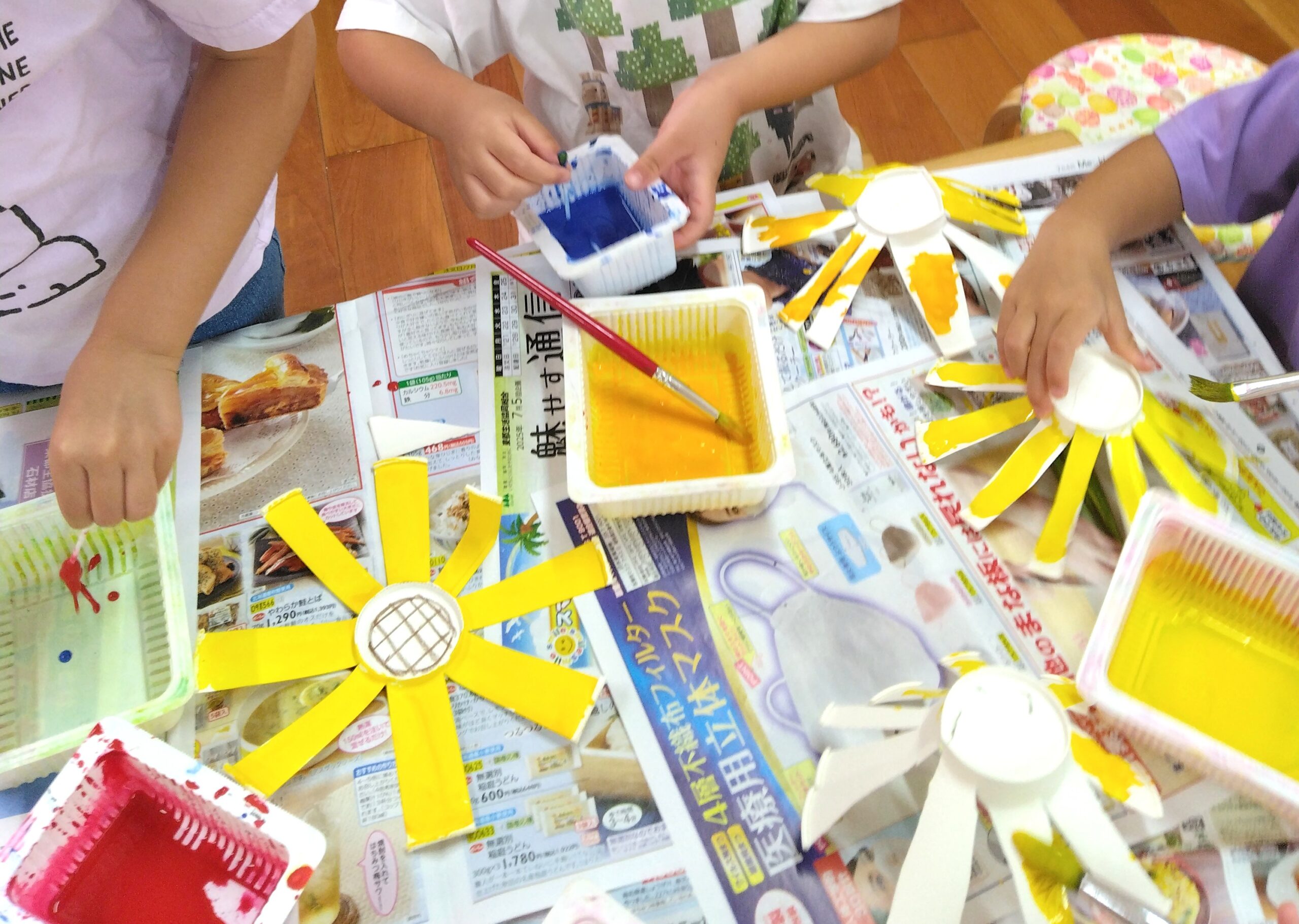 とうきょうすくわくプログラム(絵の具制作) 2025/08/27 とうきょうすくわくプログラムで、今年は「色」をテーマに子ども達の探求心を満たす活動に取り組んでいます。今回ご紹介するのは、4.5歳児クラスの絵の具を使用した制作です。それぞれが色の変化を楽しみながらつくった色を塗って完成!様々な色の組み合わせでできる色に好奇心が搔き立てられたようです。素敵な色のすいかや花ができました。 いろ~んな色のすいか いろ~んな色のひまわり 混色による色の変化の面白さに気付き、追求が止まりません♪ マスキングテープで茎を表現