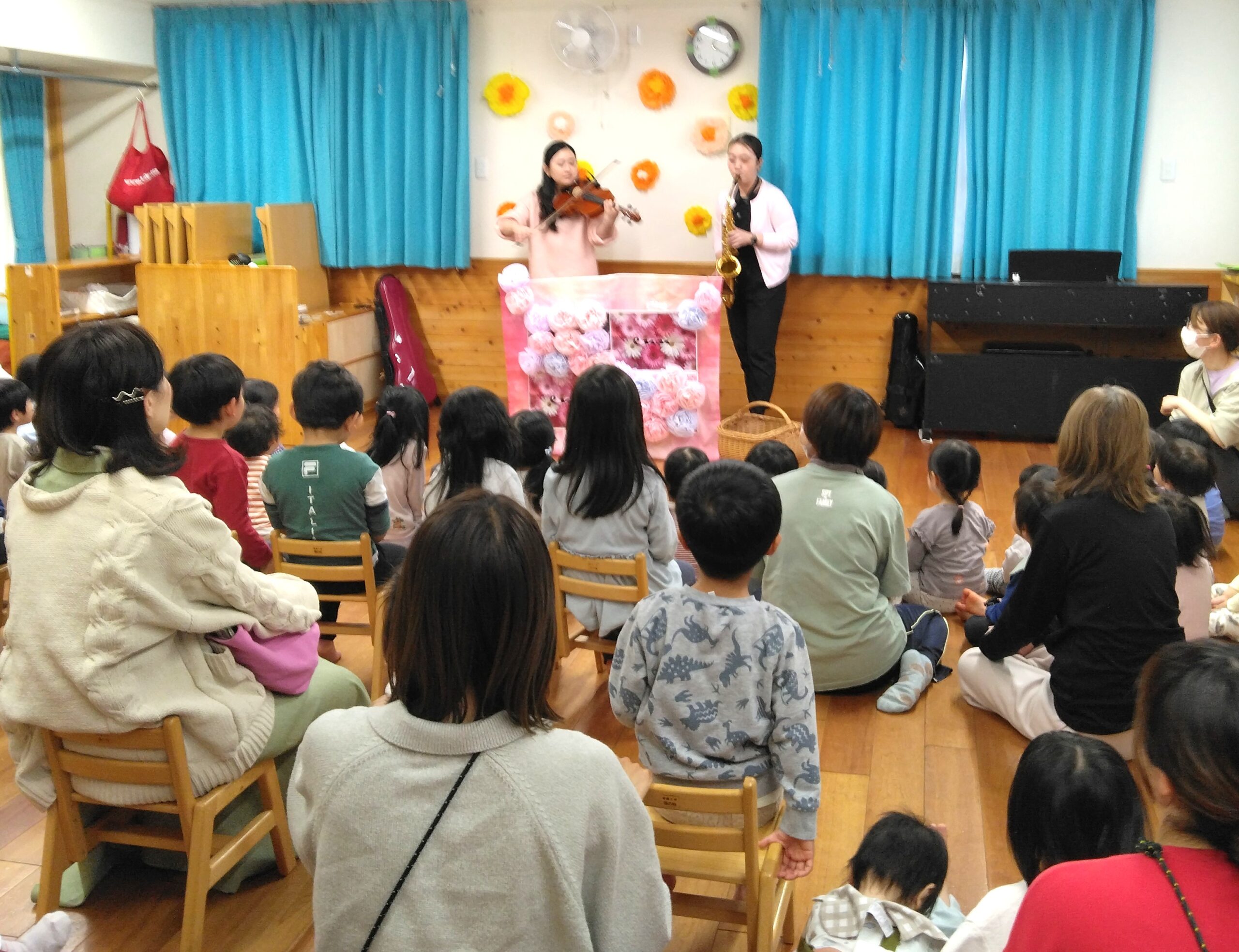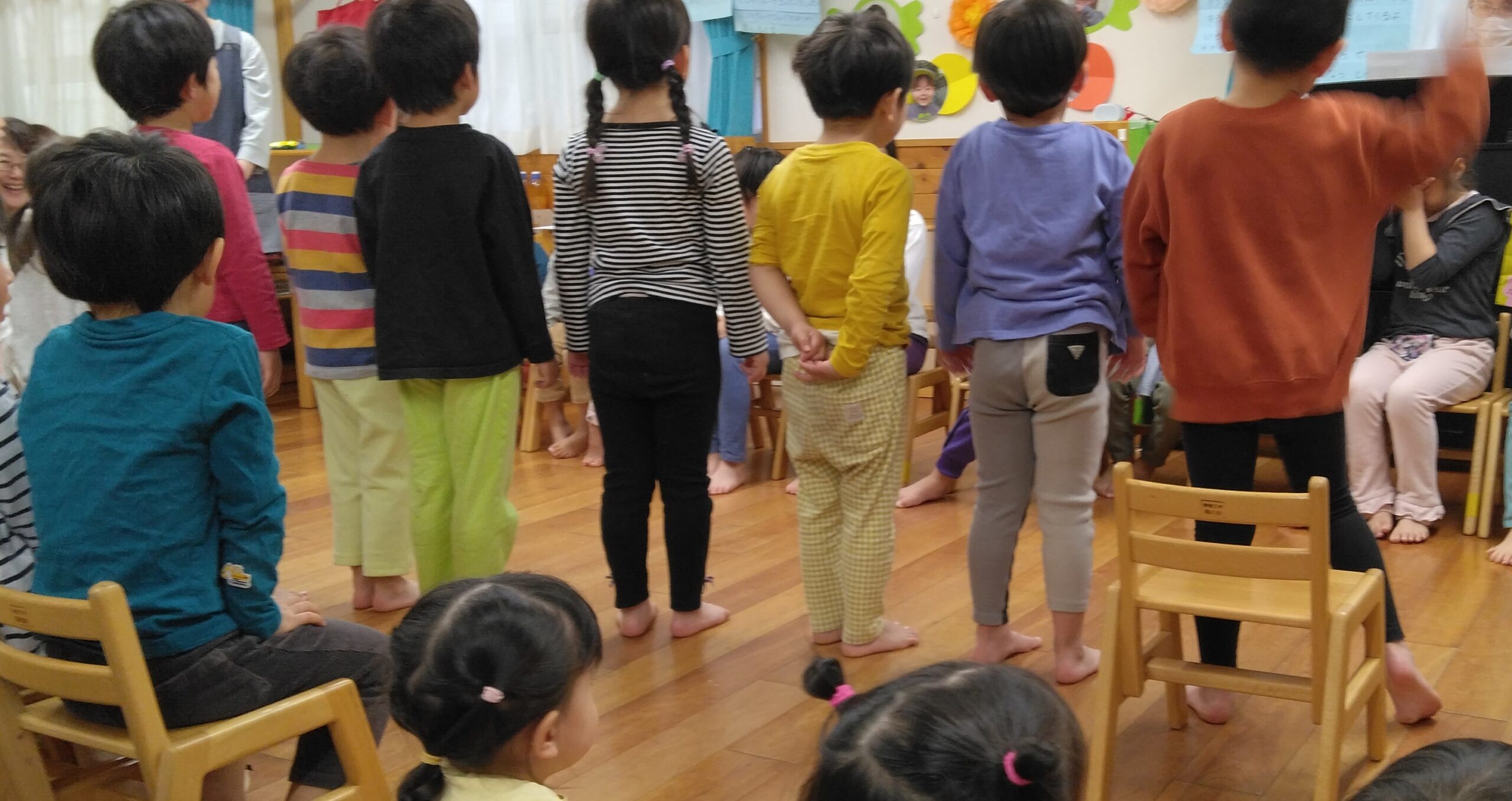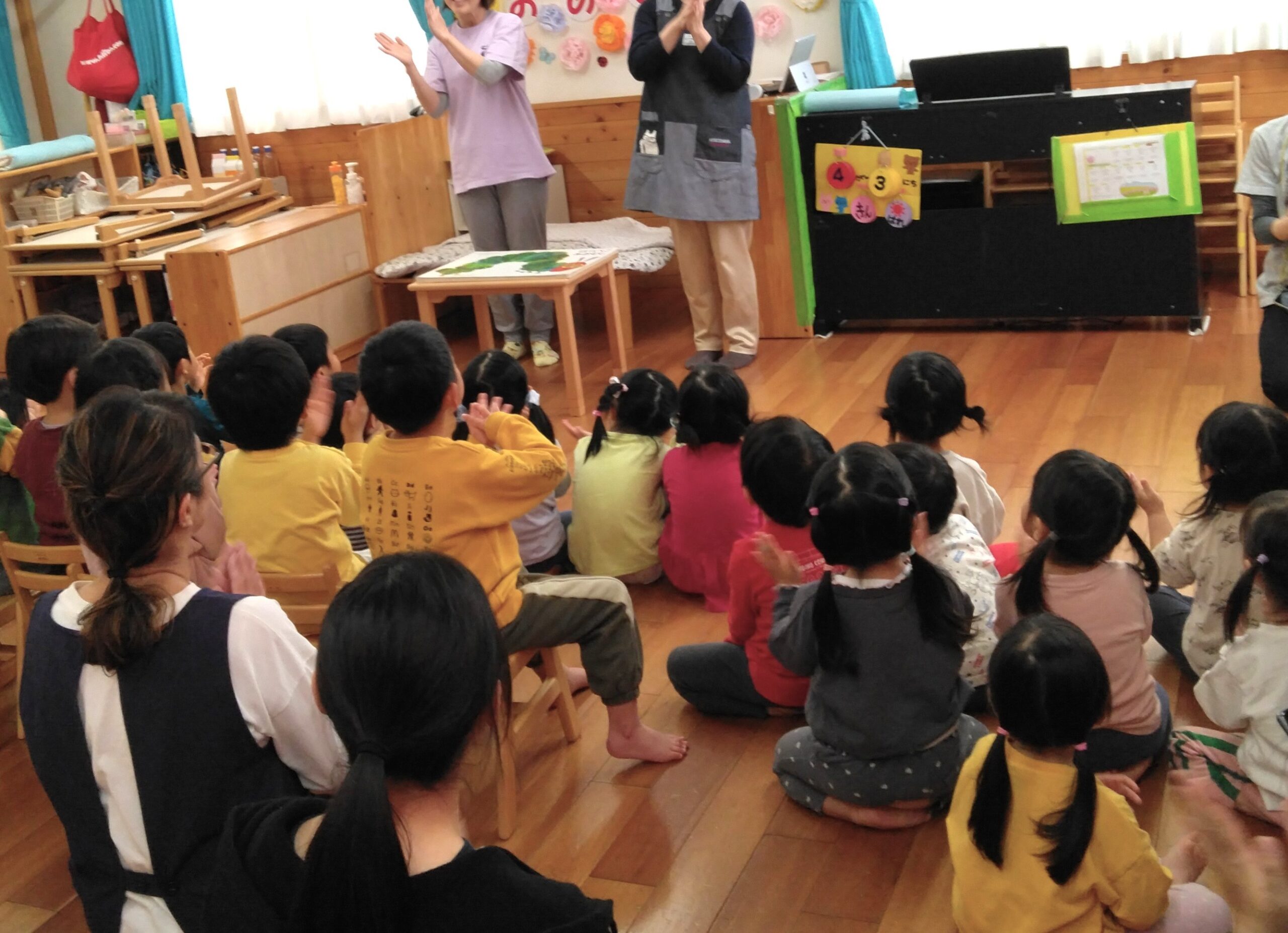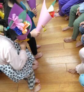 昨年度の年度末に地域で活動している演奏家を招いて春のコンサートを開催しました。早くお迎えに来た保護者も一緒に素敵なひと時を過ごしました。演奏家『enn』がインスタグラムであゆみ保育園の様子を配信中です!ぜひご覧ください。可愛い歌声がきこえてきますよ~♪ さて、年度が替わって進級した子ども達。そして新たに12人の子ども達が入園してきました。進級・入園お祝い会では、みんなで大型絵本を見たりダンスを踊ったりしてお祝いしました。