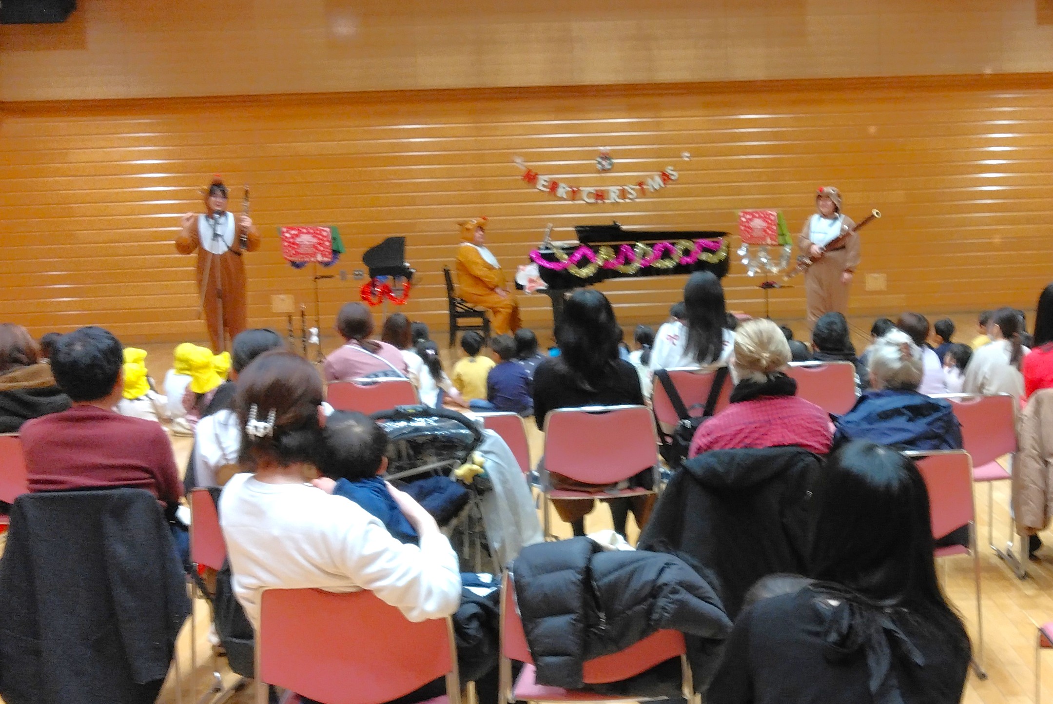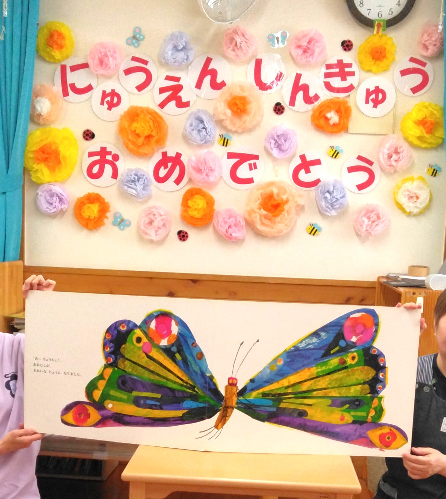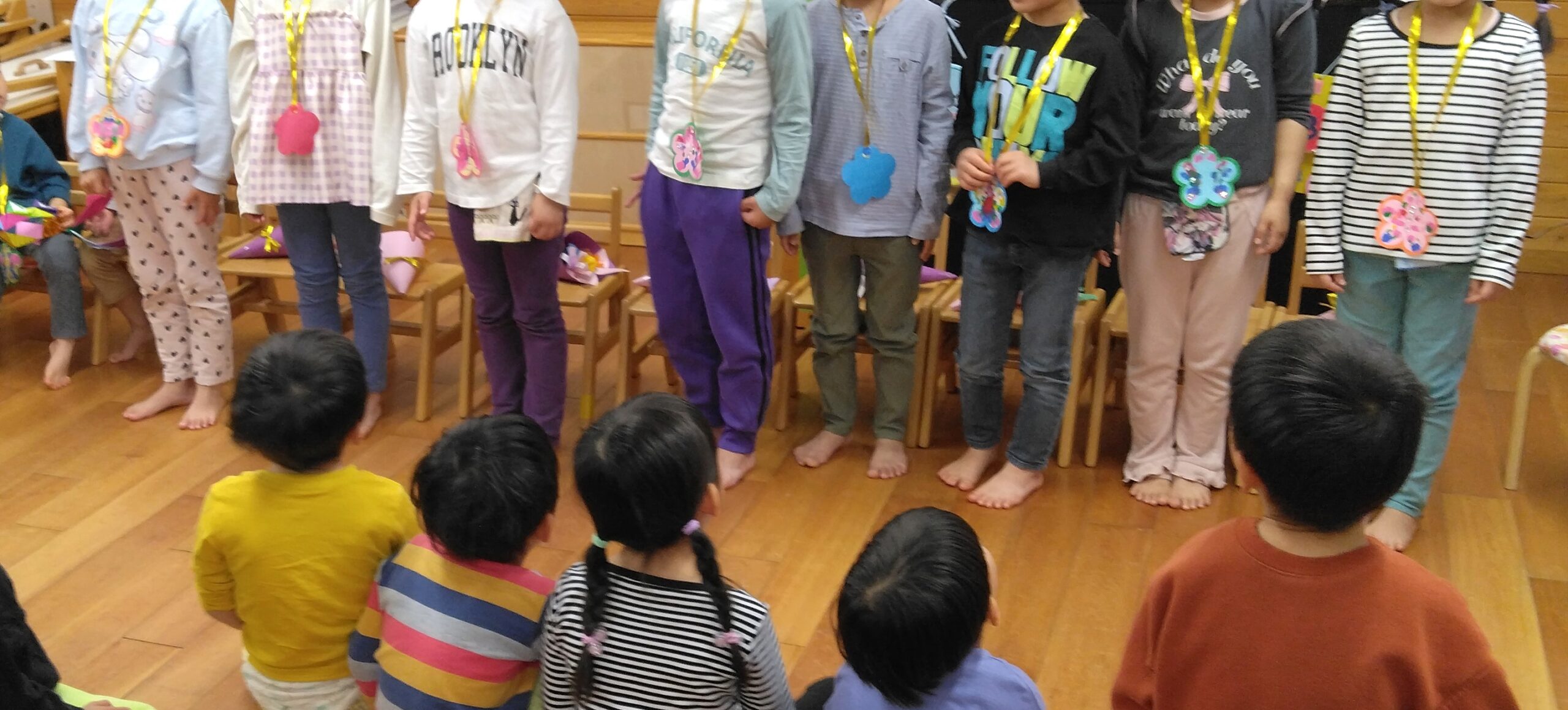 昨年度の年度末に地域で活動している演奏家を招いて春のコンサートを開催しました。早くお迎えに来た保護者も一緒に素敵なひと時を過ごしました。演奏家『enn』がインスタグラムであゆみ保育園の様子を配信中です!ぜひご覧ください。可愛い歌声がきこえてきますよ~♪ さて、年度が替わって進級した子ども達。そして新たに12人の子ども達が入園してきました。進級・入園お祝い会では、みんなで大型絵本を見たりダンスを踊ったりしてお祝いしました。