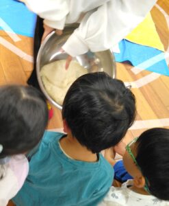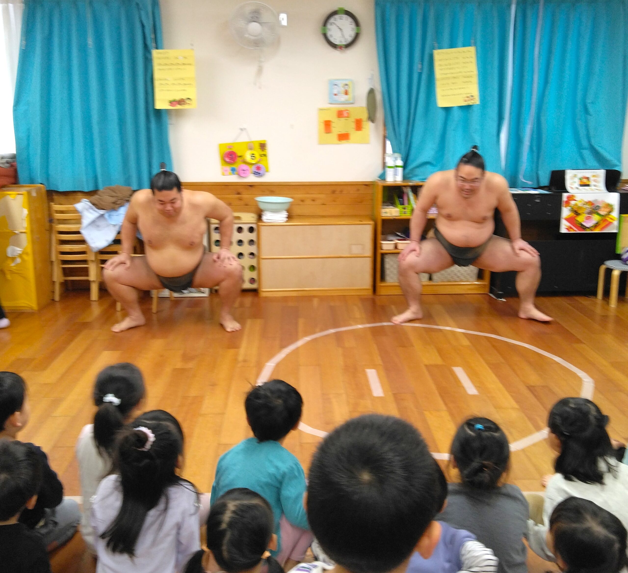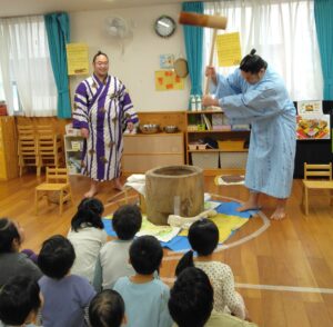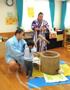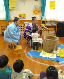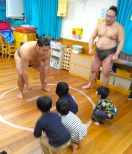 大嶽部屋(おおたけべや)から力士2人を招いて餅つきとすもうを楽しみました。力士の餅つきに合わせて「よいしょ~!よいしょ~!」と子ども達も力強い掛け声で応援。餅つきの後は四股踏みを教えてもらい皆で四股を踏んで準備体操をしてから、すもうを取りました!最後に子ども達から「どうやっておおきくなるんですか?」という質問が出ましたが、好き嫌いなく沢山食べて昼寝をするということでした。また、「ごはんをつくるひとはなんにんですか?」という質問に対しては、当番で3人ずつで作るということでした。YouTube配信しているそうで、「みてね~!」と言われると「は~い!」と元気に返事をしていた子ども達です(^^♪