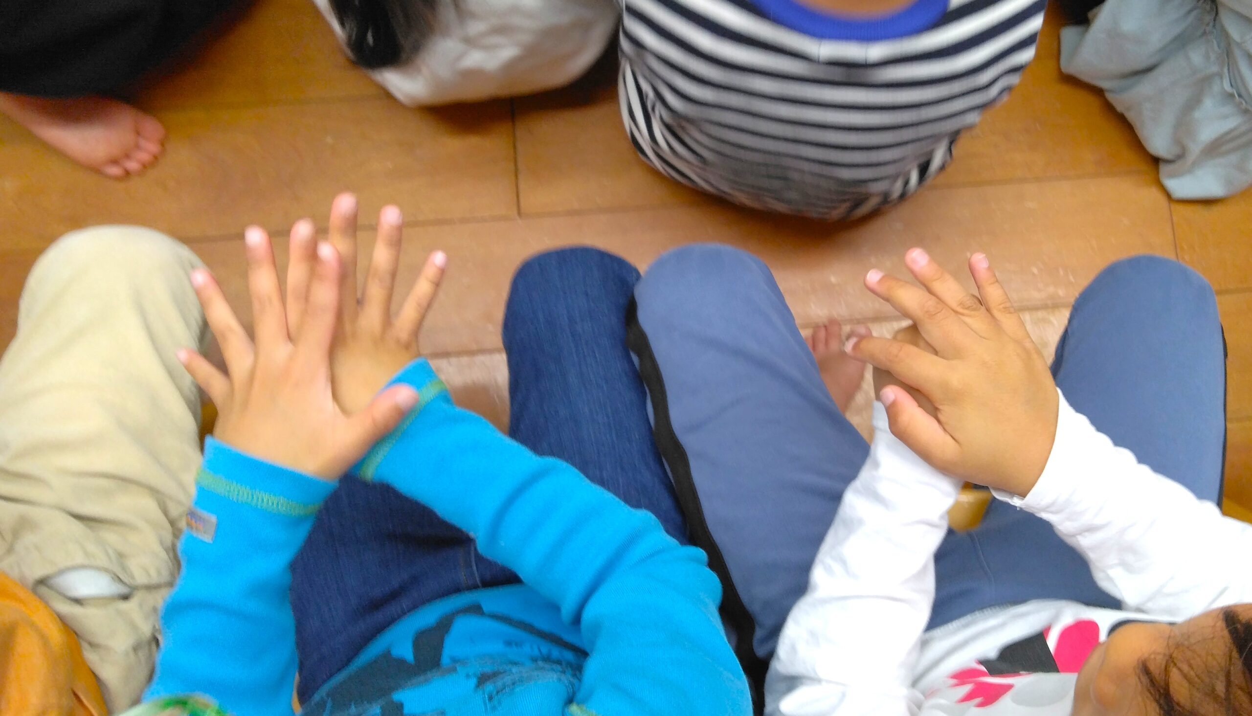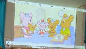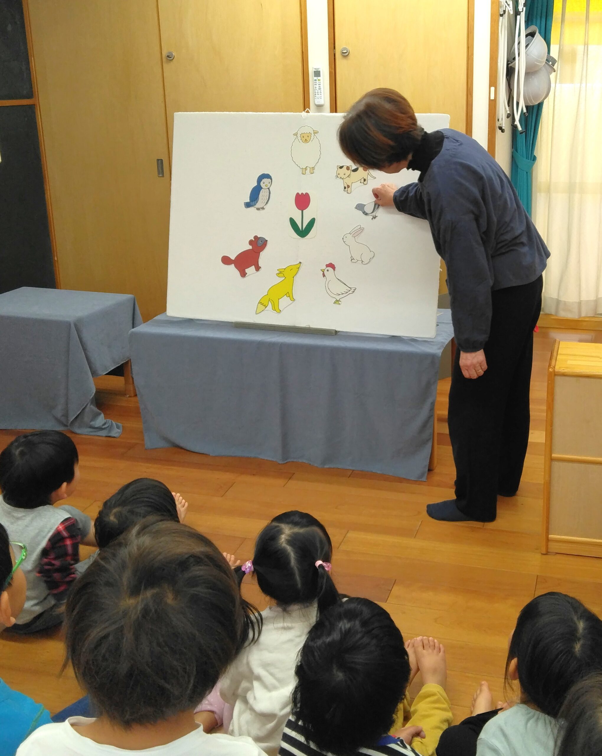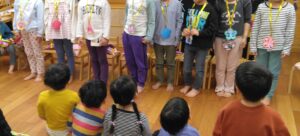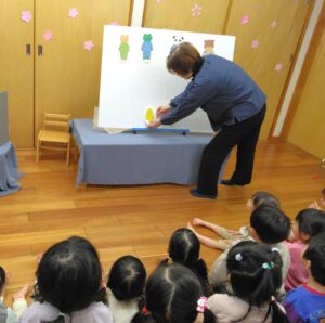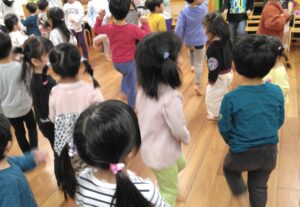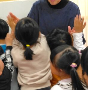 4・5歳児クラス向けのお話では、前回いらしたときに子ども達からリクエストがあったものと、おはなしの先生からの宿題だった手遊びも楽しみました。4月から小学生になる子ども達にとっては最後となります。お別れの時は何度もハイタッチをしていました。