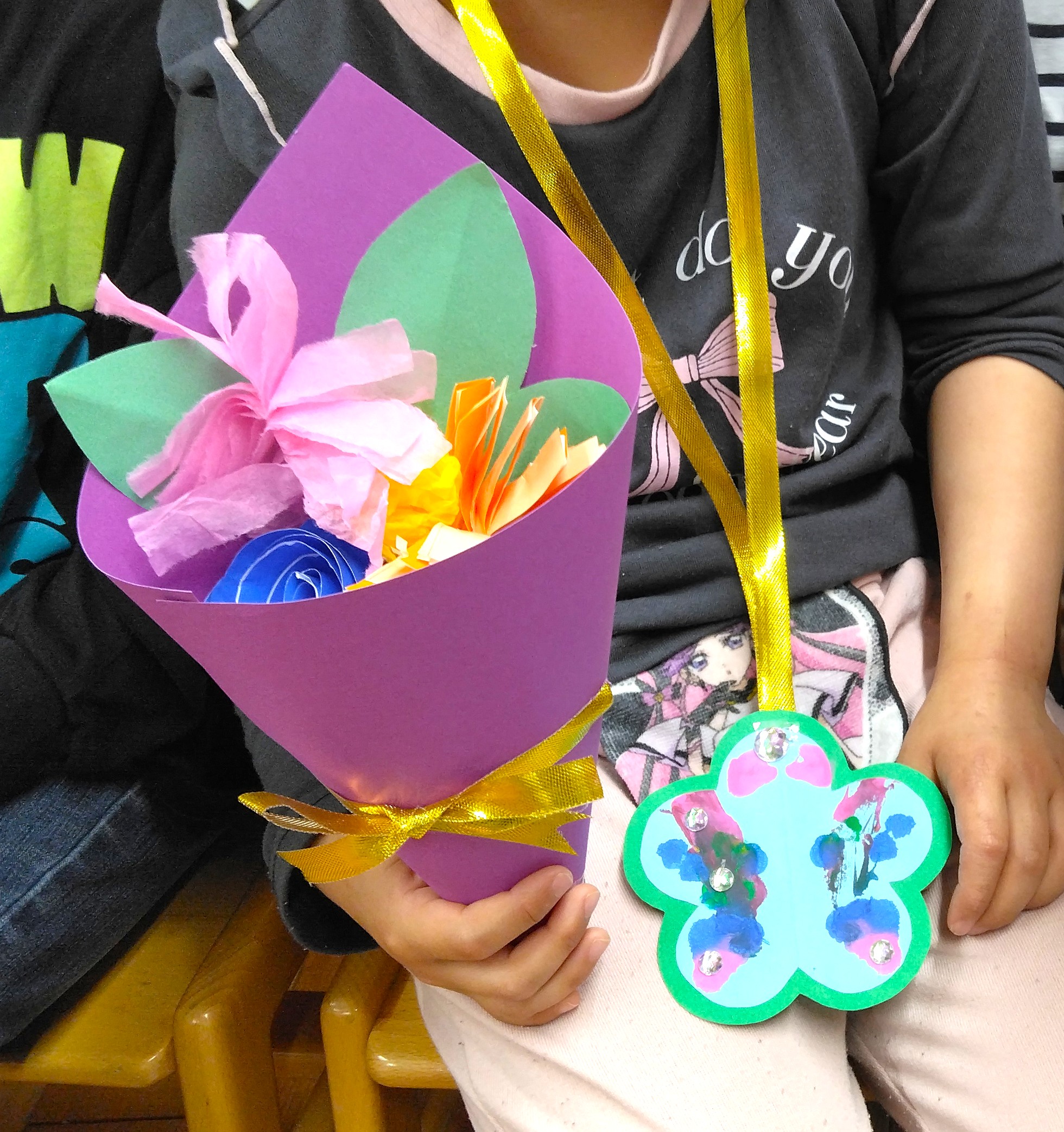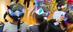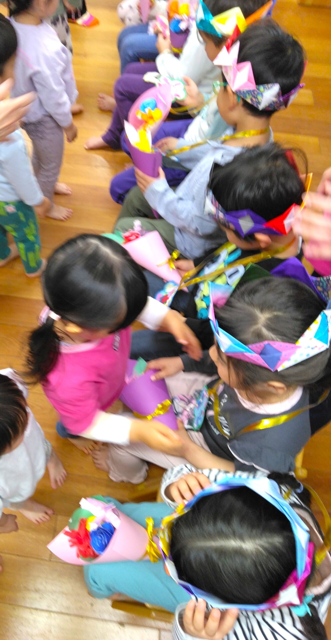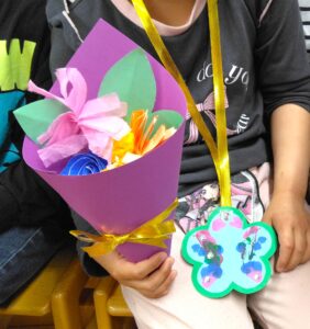 翌日は、1歳児からみんなで参加する園内行事『お別れ会』が有りました。お別れする年長児にランドセルの色と小学校で楽しみにしていることは何かインタビューをしました。校庭で遊ぶことだけではなく、算数や図書室を楽しみにしている子もいましたよ。4歳児が卒園式で歌った歌を披露した後に、全園児で『ラーメン体操』を踊りました♪そして、4歳児から王冠、3歳児からは花束、2歳児からはペンダントのプレゼントが渡されました。お別れするのは淋しいけど、みんな素敵な小学生になってね~!