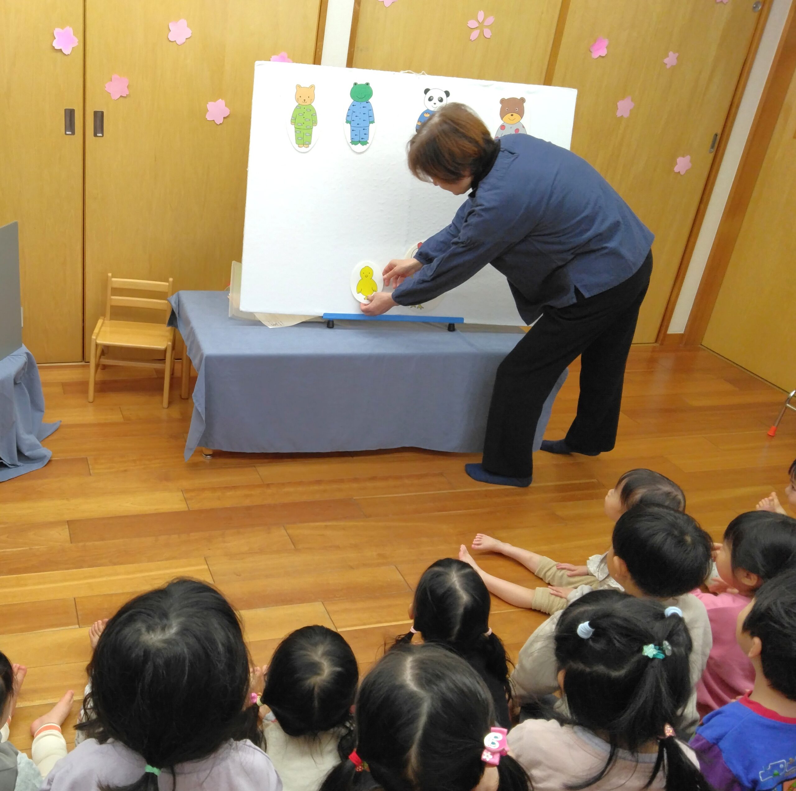 『おはなしかご』は楽しいお話をしてくれます。あゆみ保育園では、1年に4回お呼びしてお話をして頂いています。3月に今年度最後の『おはなしかご』が有りましたが、年度末にもなると1歳児クラスの子ども達もしっかり内容を理解でき、「あ~おもしろかった!」と言っている子がいました(^^♪