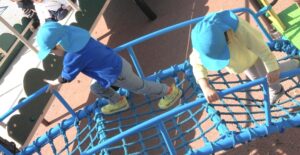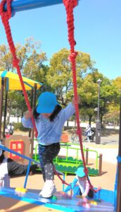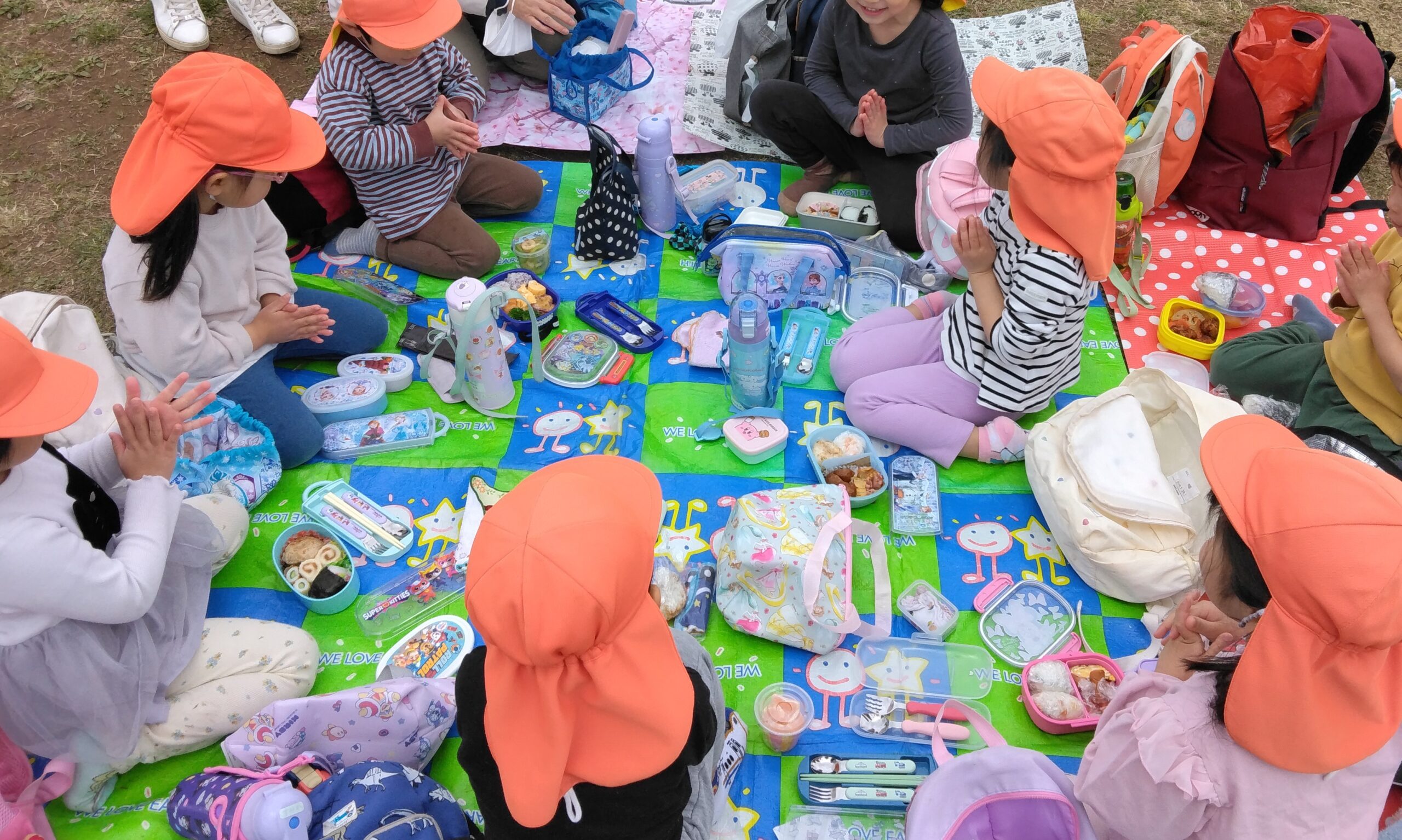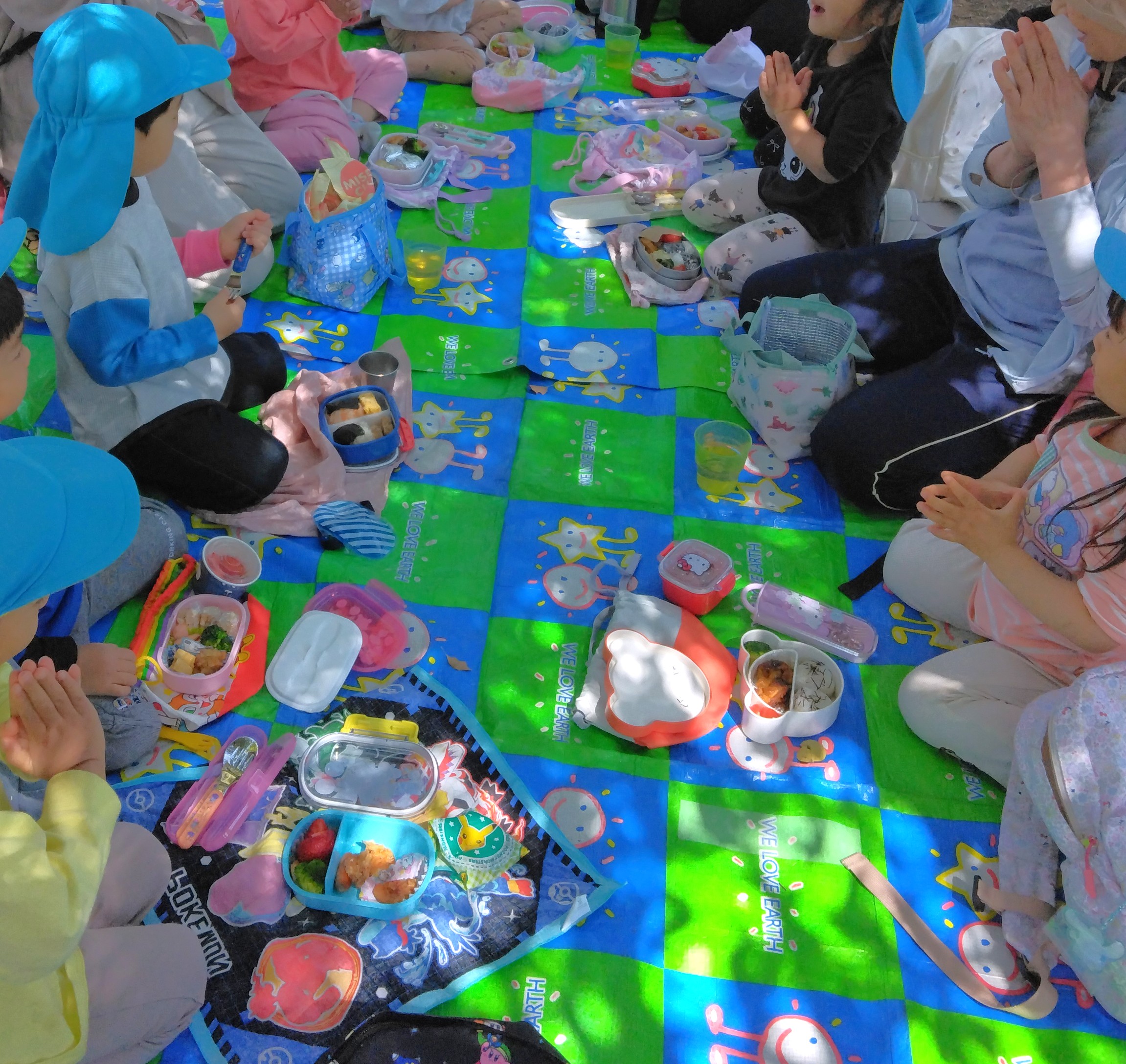 1時間ほど遊んでから広場に移り、お弁当を食べました。忙しい朝の時間にお弁当を作ってくださった保護者の皆さんに感謝です!子ども達は食べている間、ず~っとハッピーな様子でした。