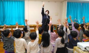 警視庁深川警察署 交通課安全教育係の方から、正しい横断歩道の渡り方や信号についてなど楽しみながら交通ルールを学びました。これから小学生になる子ども達は学校まで行って帰る間にどんな場所に気をつけなければならいのか、保護者と一緒に考えて歩く練習をするという宿題が出ました。