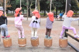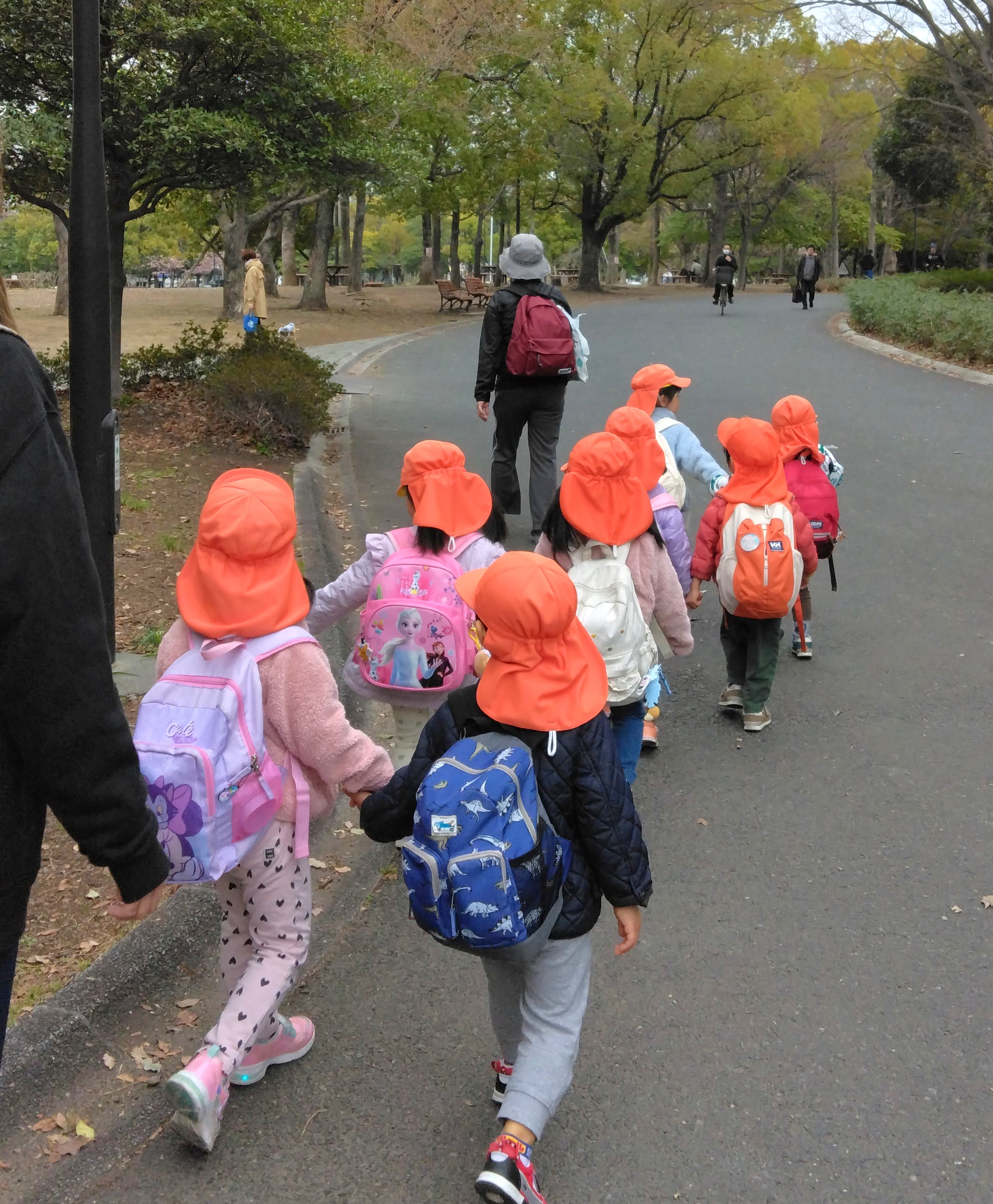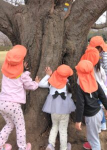 3歳児クラスでは、木場公園にお弁当を持っていきました。背中のリュックには昨日から楽しみにしていたお弁当が入っています。行き道の会話はもっぱらお弁当の中身についてでした(^^♪